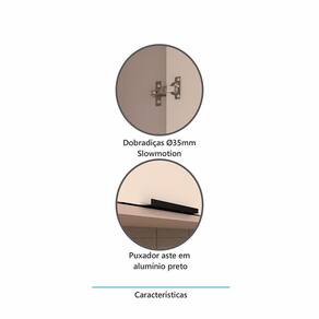 Características Estrutura: MDP 15mm Acabamento da Caixaria/Corpo: PF Acabamento das Portas/Frontal: BP Quantidade de Portas: 2 de Abrir Tipo de Dobradiças: Metálicas 35mm Slow Motion Quantidade e Tipo de Puxadores: 2 Puxador em Alumínio Preto Quantidade de Prateleiras: 4 Sistema de Montagem: Cavilhas e parafusos. Garantia do Fabricante: 3 meses Itens inclusos: Armário aéreo, manual de montagem, ferragens e acessórios.