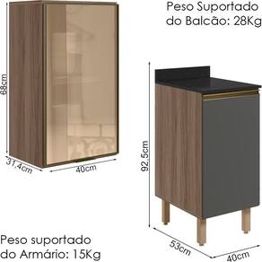 Peso Suportado do Balcão: 28Kg (20Kg tampo, 08Kg prateleira)