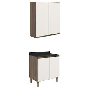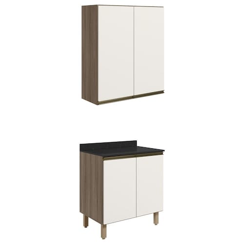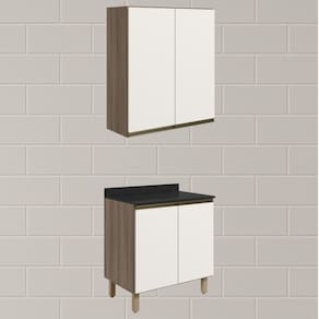Conjunto de Armário Aéreo e Balcão com Tampo para cozinha, funcional e moderno, ideal para composições que otimizam o espaço com elegância. Fabricado 100% em MDF, com estrutura e tampo de 15mm e forro de fundo de 3mm, o conjunto é composto por 1 armário aéreo com 2 portas com dobradiças de 35mm com amortecedores, que garantem fechamento suave e silencioso, além de puxadores em perfil de alumínio e 1 prateleira interna, e 1 balcão com tampo que conta com 2 portas, 1 prateleira interna, puxadores em perfil de alumínio e 4 pés com altura de 15,5cm e regulagem adicional de 1,5cm, assegurando estabilidade em diferentes tipos de piso. Estes móveis chegarão em sua casa separados em 05 volumes.