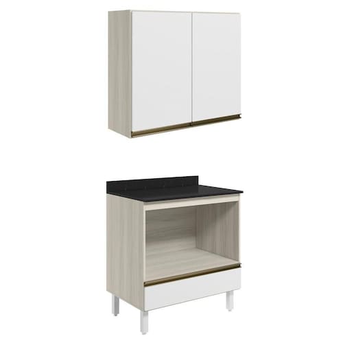 Conjunto de Armário Aéreo e Balcão para Forno com Tampo para cozinha, funcional e moderno, ideal para composições que otimizam o espaço com elegância. Fabricado em MDF, com estrutura e tampo de 15mm e forro de fundo de 3mm, o conjunto é composto por 1 armário aéreo com 2 portas com dobradiças de 35mm com amortecedores, que garantem fechamento suave e silencioso, além de puxadores em perfil de alumínio e 1 prateleira interna, e 1 balcão com tampo, que conta com 1 nicho interno para forno (77 x 42,9 cm), gaveta com corrediças telescópicas, puxador em perfil de alumínio e 4 pés com altura de 15,5cm e regulagem adicional de 1,5cm, garantindo estabilidade em diferentes tipos de piso. Estes móveis chegarão em sua casa separados em 05 volumes.