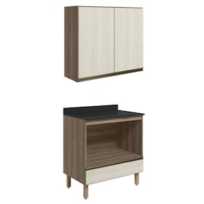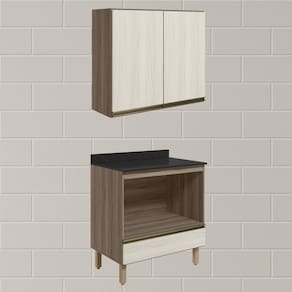 MDFConjunto de Armário Aéreo e Balcão para Forno com Tampo para cozinha, funcional e moderno, ideal para composições que otimizam o espaço com elegância. Fabricado 100% em MDF, com estrutura e tampo de 15mm e forro de fundo de 3mm, o conjunto é composto por 1 armário aéreo com 2 portas com dobradiças de 35mm com amortecedores, que garantem fechamento suave e silencioso, além de puxadores em perfil de alumínio e 1 prateleira interna, e 1 balcão com tampo, que conta com 1 nicho interno para forno (77 x 42,9 cm), gaveta com corrediças telescópicas, puxador em perfil de alumínio e 4 pés com altura de 15,5cm e regulagem adicional de 1,5cm, garantindo estabilidade em diferentes tipos de piso. Estes móveis chegarão em sua casa separados em 05 volumes.