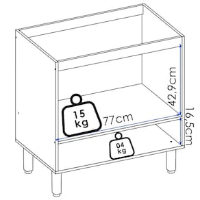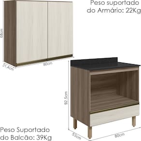 Peso Suportado do Balcão: 39Kg (20Kg tampo, nicho 15Kg e 04Kg gaveta)
