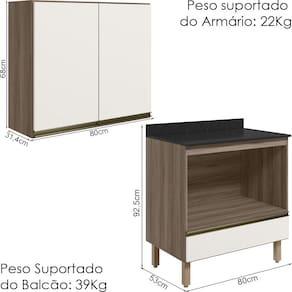 Peso Suportado do Balcão: 39Kg (20Kg tampo, nicho 15Kg e 04Kg gaveta)