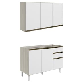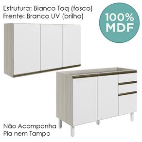Conjunto de Armário Aéreo e Balcão sem Tampo para Pia, funcional e moderno, ideal para composições que otimizam o espaço com elegância. Fabricado 100% em MDF, com estrutura de 15mm, forro de fundo de 3mm e acabamento em pintura UV (fosco ou brilho). O Conjunto é composto por 1 armário aéreo com 3 portas com dobradiças de 35mm com amortecedor, que garantem fechamento suave e silencioso, além de puxadores em perfil de alumínio e 2 prateleiras internas. O Balcão conta com 3 gavetas com corrediças telescópicas, 1 prateleira interna e 2 portas com dobradiças de 35mm com amortecedores. Os 5 pés possuem altura de 15,5cm com regulagem adicional de 1,5cm, garantindo estabilidade em qualquer piso. Não acompanha tampo nem pia. Estes móveis chegarão em sua casa separados em 04 volumes.