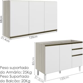 Peso Suportado do Balcão: 20Kg (12Kg gavetas e 8Kg prateleira)