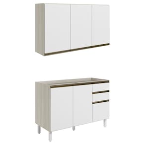 Conjunto de Armário Aéreo e Balcão sem Tampo para Pia, funcional e moderno, ideal para composições que otimizam o espaço com elegância. Fabricado em MDF, com estrutura de 15mm, forro de fundo de 3mm e acabamento em pintura UV (fosco ou brilho). O Conjunto é composto por 1 armário aéreo com 3 portas com dobradiças de 35mm com amortecedor, que garantem fechamento suave e silencioso, além de puxadores em perfil de alumínio e 2 prateleiras internas. O Balcão conta com 3 gavetas com corrediças telescópicas, 1 prateleira interna e 2 portas com dobradiças de 35mm com amortecedores. Os 5 pés possuem altura de 15,5cm com regulagem adicional de 1,5cm, garantindo estabilidade em qualquer piso. Não acompanha tampo nem pia. Estes móveis chegarão em sua casa separados em 04 volumes.