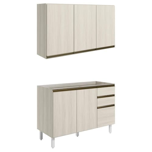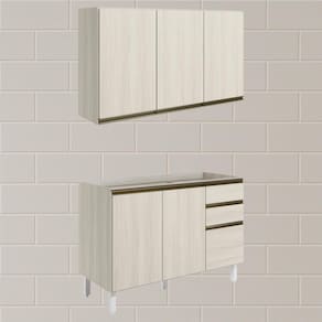 Conjunto de Armário Aéreo e Balcão sem Tampo para Pia, funcional e moderno, ideal para composições que otimizam o espaço com elegância. Fabricado em MDF, com estrutura de 15mm, forro de fundo de 3mm e acabamento em pintura UV (fosco ou brilho). O Conjunto é composto por 1 armário aéreo com 3 portas com dobradiças de 35mm com amortecedor, que garantem fechamento suave e silencioso, além de puxadores em perfil de alumínio e 2 prateleiras internas. O Balcão conta com 3 gavetas com corrediças telescópicas, 1 prateleira interna e 2 portas com dobradiças de 35mm com amortecedores. Os 5 pés possuem altura de 15,5cm com regulagem adicional de 1,5cm, garantindo estabilidade em qualquer piso. Não acompanha tampo nem pia. Estes móveis chegarão em sua casa separados em 04 volumes.