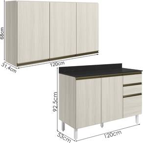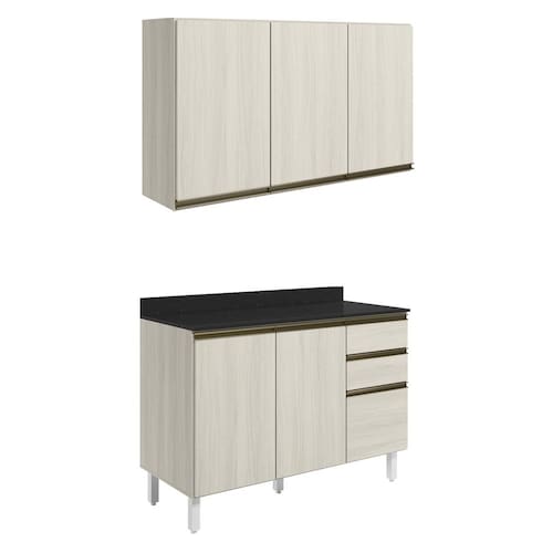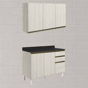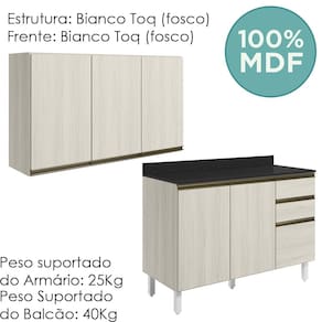 MDFConjunto de Armario Aereo e Balcao com Tampo para cozinha, funcional e moderno, ideal para composições que otimizam o espaço com elegância. Fabricado 100% em MDF, com estrutura e tampo de 15mm, forro de fundo de 3mm e acabamento em pintura UV (fosco ou brilho). Conjunto é composto por 1 armário aéreo com 3 portas com dobradiças de 35mm com amortecedor, que garantem fechamento suave e silencioso, além de puxadores em perfil de alumínio e 2 prateleiras internas. Balcão com tampo 15mm que conta com 3 gavetas com corrediças telescópicas, 1 prateleira interna e 2 portas com dobradiças de 35mm com amortecedores. Os 5 pés possuem altura de 15,5cm com regulagem adicional de 1,5cm, garantindo estabilidade em qualquer piso. Estes móveis chegarão em sua casa separados em 05 volumes.