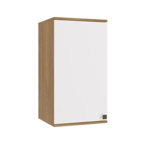 Acabamento: Pintura Brilho / Pintura Touch | Acabamento da Fita Borda: Papel | Cor: Nogueira/Branco | Dobradiça: Com Amortecimento | Garantia: 3 meses para defeito de fabricação | Matéria-prima: MDF | Peso suportado por cada prateleira: 7 kg | Puxadores: Metálicos | Quantidade de portas: 1 | Quantidade de prateleiras: 1 | Sistema de montagem: Parafuso Philips | Tipo de porta: Bater