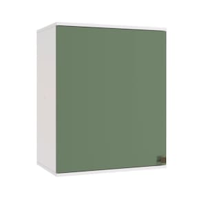 Acabamento: Pintura Brilho / Pintura Fosco | Acabamento da Fita Borda: Papel | Cor: Branco/Verde Oliva | Dobradiça: Com Amortecimento | Garantia: 3 meses para defeito de fabricação | Matéria-prima: MDF | Peso suportado por cada prateleira: 7 kg | Puxadores: Metálicos | Quantidade de portas: 1 | Quantidade de prateleiras: 1 | Sistema de montagem: Parafuso Philips | Tipo de porta: Bater | Tipo de móveis: Armário | Materiais do corpo: MDF