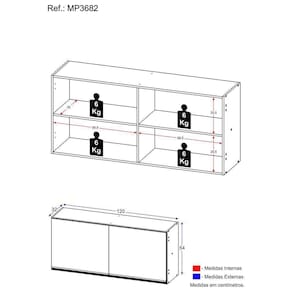 Dimensões do produto montado: Altura: 54cm | Largura: 120cm | Profundidade: 32cm *Você pode consultar as medidas internas na imagem técnica do produto. *As cores do produto podem sofrer variações de tonalidade de acordo com as configurações do seu dispositivo.