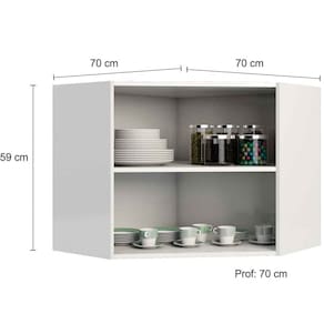 Armário Aéreo Modulado De Canto, com estrutura e portas em MDP 15mm, acabamento em pintura UV na cor Branca (Brilho). Composto por 02 portas com dobradiças metálicas, prateleira interna com amplo espaço interno, puxadores em alumínio, este armário de canto obliquo é um modulo avulso da composição Cozinha Modulada Evidence e é ideal para compor sua cozinha como desejar. Este móvel chegará em sua casa separado em 01 volume.