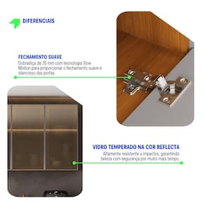 Fechamento suave e silencioso: Dobradiças de 35 mm com tecnologia Slow Motion, que evitam batidas e aumentam a vida útil do móvel.