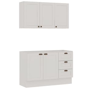 Um conjunto modular de cozinha sendo 2 peças: 1 armário aéreo 3 portas 120 cm, 1 balcão de 120 cm.