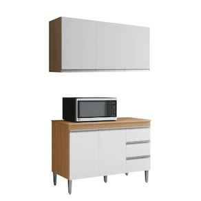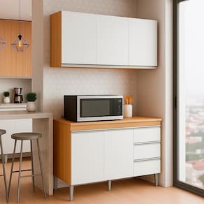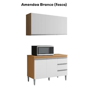 Armário Aéreo e Balcão com Tampo Andreia, ideal para otimizar o espaço da sua cozinha. Produzido em MDP 12/15 mm (fundo 3 mm) com acabamento em pintura UV. Possui portas e gavetas com dobradiças e corrediças metálicas, puxadores em alumínio e prateleiras internas. O balcão conta com pés em plástico com regulagem. Produto entregue em 03 volumes.