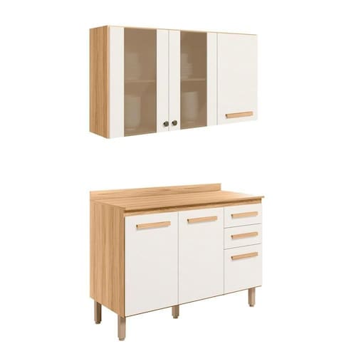 Armário Aereo E Balcão com Tampo 16982x16988, acabamento refinado e visual sofisticado. Estrutura em MDP, com caixa de 12 mm e frente em 15 mm, e excelente acabamento em Fosco/Brilho. O armário aereo é composto por 03 portas, sendo 2 com vidros, com dobradiças metálicas, para garantir a suavidade no abrir e fechar, 1 prateleira interna e puxadores em MDF. O Balcão é composto por 02 portas, com dobradiças metálicas, 01 prateleira e puxadores em MDF. Acompanha 05 pés com regulagem de altura de 15,5 cm mais 1,5 de regulagem. Este móvel chegará em sua casa separado em 02 volume.