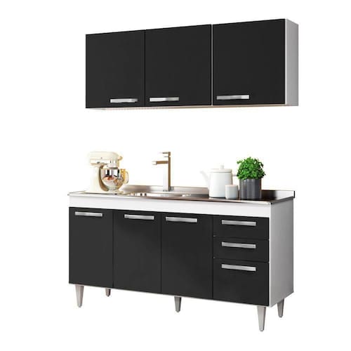 Armário Aéreo e Balcão de Pia 150cm Lisboa Branco e Preto