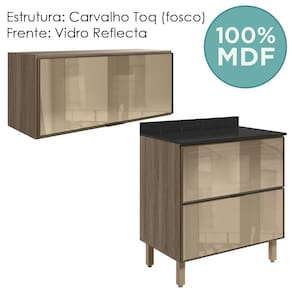 MDF e VidroFuncional e moderno, o Conjunto de Armário Aéreo Basculante e Balcão com Tampo e 2 Gavetas em Vidro para Cozinha é ideal para composições que otimizam o espaço com elegância. Fabricado 100% em MDF, com estrutura e tampo de 15mm e fundo de 3mm, o conjunto é composto por 1 armário aéreo com porta basculante com frente em vidro reflecta em perfil alumínio equipada com pistão a gás e amortecedor; e 1 balcão com tampo, que conta com 2 gavetas com corrediças telescópicas, frentes em vidro reflecta em perfil alumínio e 4 pés com altura de 15,5cm e regulagem adicional de 1,5cm, garantindo estabilidade em diferentes tipos de piso. Estes móveis chegarão em sua casa separados em 05 volumes.