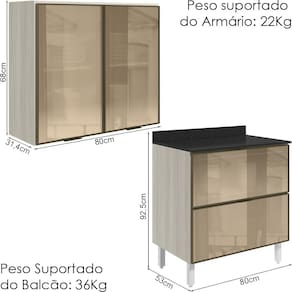 Peso Suportado do Balcão: 36Kg (20Kg tampo, 16Kg gavetas)