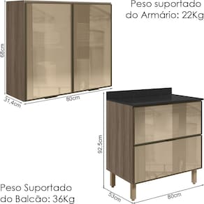 Peso Suportado do Balcão: 36Kg (20Kg tampo, 16Kg gavetas)