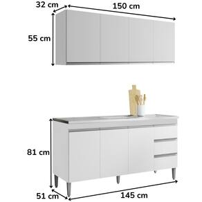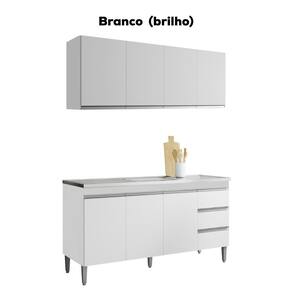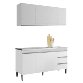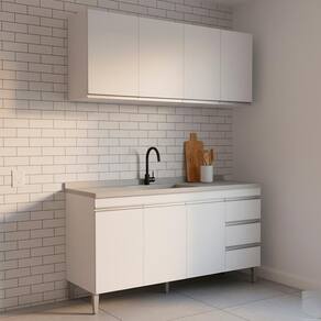 Armário Aéreo e Balcão para Pia Andreia, ideal para otimizar o espaço da sua cozinha. Produzido em MDP 12/15 mm (fundo 3 mm) com pintura UV. Possui portas e gavetas com dobradiças e corrediças metálicas, puxadores em alumínio e prateleiras internas. O balcão possui pés em plástico com regulagem. Não acompanha pia/tampo. Produto entregue em 02 volumes.