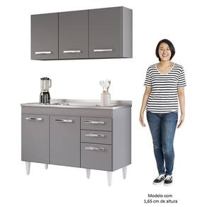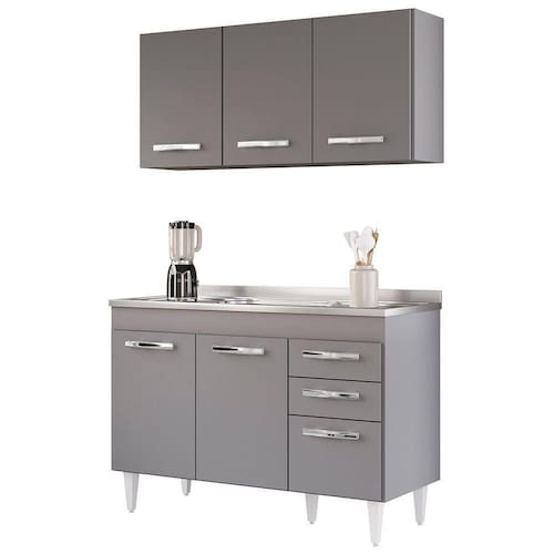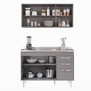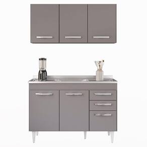 É preciso estar atento na hora de escolher o móvel que vai compor o ambiente, afinal com cozinhas cada vez menores ele deve ser compacto e funcional, assim como o Armário Aéreo Honduras e Balcão Gabinete com Pia 120cm Suécia Cinza, da Lumil. Esse jogo apesar de compacto, é excelente para organizar seus utensílios, panelas, louças e mantimentos. O Armário Aéreo conta com 3 portas que protegem o compartimento interno com 1 prateleira, já o Balcão Gabinete com pia inox de 120cm conta com 3 portas e 2 gavetas e prateleira, ou seja, bastante espaço para manter tudo no lugar e deixar a sua cozinha mais agradável, os puxadores são em PVC cromado, resistentes e fáceis de limpar. Ah! A pia já acompanha cuba e vávula, as dobradiças e corrediças são metálicas, garantido a qualidade. Ambos possuem prateleira e estrutura em MDP 15mm com revestimento em BP, o que resulta em um acabamento resistente e duradouro.Gostou? Então agora é a hora de você agregar funcionalidade a sua Cozinha de um jeito simples, adicione agora mesmo em seu carrinho e garanta! ESPECIFICAÇÕES Dimensão dos Produtos (L x A x P)Aéreo: 120 cm x 54 cm x 29 cm. Balcão: 117 cm x 83 cm x 50 cm. Pia Inox: 120 cm x 13 cm x 53 cm. Peso: 85 Kg. **ACOMPANHA PIA INOX COM CUBA E VÁLVULA 120CM. Características do ProdutoMaterial da Estrutura: MDP 15 mm. Material do Fundo: MDF 3 mm. Peso Suportado: 85 Kg distribuídos. Acompanha Pia: Sim. Acompanha Tampo: Não. Acabamento: Melamina BP. Escala de Brilho: Fosco. Quantidade de Portas: 6 Portas. Material da Porta: MDP. Tipo de Porta: Convencional. Material das Dobradiças: Metálicas. Possui Gavetas: Sim. Quantidade de Gavetas: 2 Gavetas. Material das Corrediças: Metálicas. Tipo de Puxador: PVC cromado. Possui Prateleiras: Sim. Quantidade de Prateleiras: 2 Prateleiras. Material da Prateleira: MDP. Possui Pés: Sim. Quantidade de Pés: 5 Pés. Tipo de Pés: PVC com regulagem. Diferenciais:- Design moderno. - Pés 17cm com regulagem. - Amplo espaço interno. - Acompanha pia inox.Sistema de Montagem: Cavilhas/Parafusos. Manual de Montagem: Sim. Complexidade da Montagem: Baixa. Volumes: 3 Volumes. Conteúdo da Embalagem: 1 Balcão, 1 Pia Inox, 1 Armário Aéreo. Garantia do Fabricante: 90 dias contra defeito de fabricação. Montagem: Recomendamos que seja feita por um profissional. Recomendação de Limpeza: Utilize pano úmido. Observações importantes:- Produto para uso residencial em ambiente interno, não devendo ficar exposto diretamente ao sol, calor e umidades excessivas.- Pode haver alguma diferença de tonalidade entre a imagem e o produto real, por conta do tratamento de imagens e a calibração de cores do seu monitor.- As imagens são meramente ilustrativas, não acompanham objetos de decoração e eletrônicos.- Confira o estado da embalagem, não devendo assinar o comprovante em caso de danos.- Não asseguramos, no ato da entrega, por subir escadas/elevadores, pelo transporte por guincho em apartamentos ou montagem, desmontagem e instalações. Eventuais despesas são por conta do comprador.- Confira as dimensões do produto e certifique-se de que passará normalmente por supostos elevadores, portas, escadas e/ou corredores de sua residência.