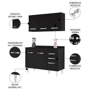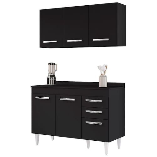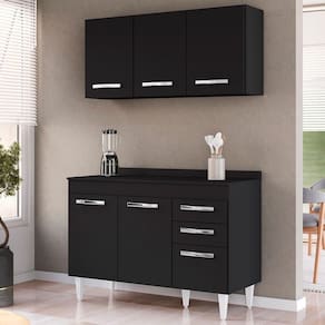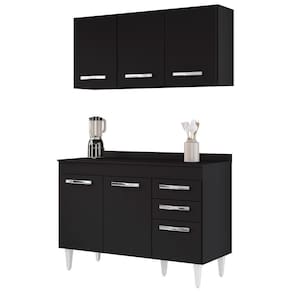 É preciso estar atento na hora de escolher o móvel que vai compor o ambiente, afinal com cozinhas cada vez menores ele deve ser compacto e funcional, assim como o Armário Aéreo Honduras e Balcão Gabinete com Tampo 120cm Suécia Preto, da Lumil. Esse jogo apesar de compacto, é excelente para organizar seus utensílios, panelas, louças e mantimentos. O Armário Aéreo conta com 3 portas que protegem o compartimento interno com 1 prateleira, já o Balcão Gabinete com tampo de 120cm conta com 3 portas e 2 gavetas e prateleira, ou seja, bastante espaço para manter tudo no lugar e deixar a sua cozinha mais agradável, os puxadores são em PVC cromado, resistentes e fáceis de limpar. Ah! As dobradiças e corrediças são metálicas, garantido a qualidade. Ambos possuem prateleira e estrutura em MDP 15mm com revestimento em BP, o que resulta em um acabamento resistente e duradouro.Gostou? Então agora é a hora de você agregar funcionalidade a sua Cozinha de um jeito simples, adicione agora mesmo em seu carrinho e garanta!