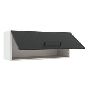 Este Armário Aéreo conta com uma porta basculante com puxador de alça em alumínio. Além disso, a porta possui dobradiças metálicas com amortecimento que proporcionam um fechamento suave e pistão a gás que a mantém suspensa.
