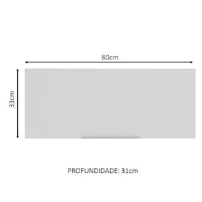 O armário aéreo de 80 cm conta com uma porta basculante com puxador slim em alumínio, dobradiças metálicas com amortecimento que proporciona um fechamento suave e pistão a gás que mantém a porta suspensa.