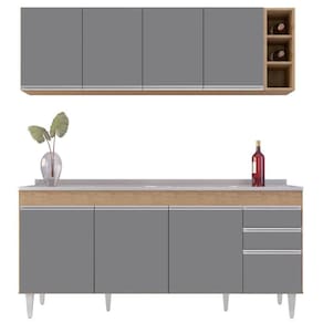 Fabricado em MDP com acabamento em pintura UV, o Balcão Gabinete Dallas Castanho/Cinza é uma excelente opção para quem tem uma cozinha com amplo espaço disponível para louça, panelas e demais acessórios utilizados neste ambiente que podem ser aproveitados da melhor maneira. Além da estrutura, também conta com pés reguláveis em PVC, 4 portas convencionais, 1 porta basculante com puxador em alumínio embutido e 1 prateleira interna. Além é claro, de 2 gavetas na lateral também com puxadores embutidos para facilitar o manuseio e com corrediças metálicas e espaço ótimo para guardar seus talheres e utensílios. Ah, e ainda é um balcão com pia inox com características que permitem melhor desempenho ao escoar a água e possibilita a utilização de diferentes objetos sobre ela, tudo para te auxiliar! Mas não acaba por aí! Esse conjunto também conta com a praticidade do armário aéreo Nevada e o Nicho Riad, que possuem a mesma estrutura em MDP, o aéreo apresenta 4 portas de puxadores em perfil alumínio e ainda conta com 1 prateleira interna oferecendo espaço e organização, já o nicho adega oferece três repartições para seus utensílios!