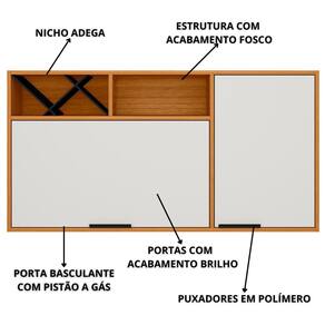 O Armário Aéreo 120 cm 2 Portas com Nicho Adega é a escolha perfeita para quem deseja aliar praticidade e elegância em seu ambiente. Fabricado em MDP 15mm com acabamento em pintura UV. Com 2 portas sendo uma delas basculante com pistão a gás e uma com dobradiças metálicas reforçadas de 26mm garantem um abrir e fechar silencioso e suave. Conta com amplo espaço interno e 2 nichos decorativos, sendo um deles com garrafeiro móvel em MDF recortado a laser para perfeito encaixe, puxadores em polímero preto. Este móvel chegará em sua casa separado em 01 volume.