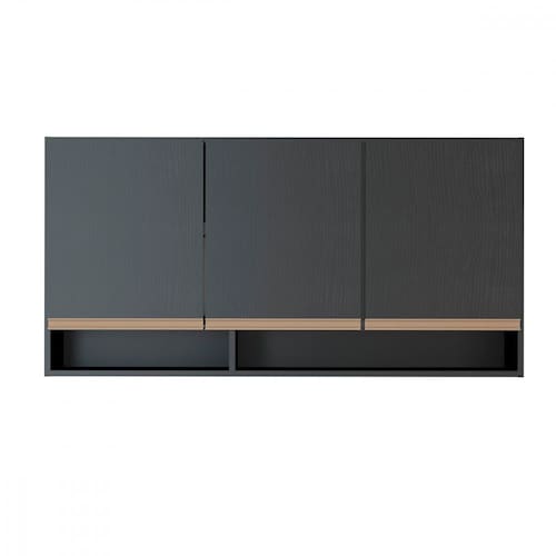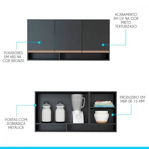 Armário Aéreo de Cozinha Sabrina 120cm Preto ? Tendência, Estilo e Organização na Medida Certa O Armário Aéreo para Cozinha Sabrina foi desenvolvido para oferecer praticidade e modernidade com um visual marcante, funcional e cheio de atitude. Ideal para compor cozinhas planejadas com módulos versáteis, acompanha as últimas tendências com acabamento preto texturizado e estrutura em avelã. Conta com três portas, prateleira interna e um nicho, perfeito para manter o ambiente sempre organizado. O destaque fica por conta dos puxadores em perfil na cor bronze, que agregam sofisticação ao conjunto. A linha Sabrina é produzida com materiais de excelente qualidade, garantindo durabilidade, resistência e ótimo aproveitamento de espaço para o dia a dia.