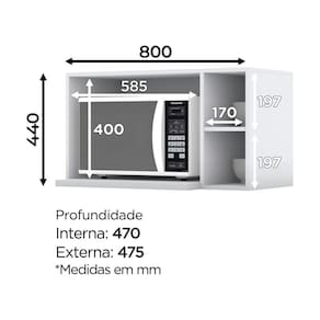 O Armário Micro-ondas possui 44 cm de altura, 80 cm de largura e 47,5 cm de profundidade. Projetado para proporcionar praticidade e funcionalidade ao uso, este produto foi desenvolvido para atender os mais criteriosos usuários aliando funcionalidade com elegância. Um novo conceito inspirado nas clássicas cozinhas estilo americano, seu design contemporâneo embeleza qualquer ambiente.