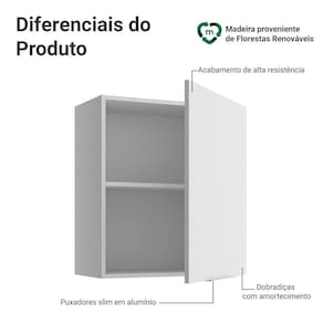 Com duas prateleiras internas, o módulo oferece amplo espaço para acomodar diferentes itens de forma prática e organizada. A porta conta com dobradiças com amortecimento, que proporciona fechamento suave e silencioso, o puxador slim em alumínio adicionam modernidade e sofisticação ao design. Além disso, o acabamento branco de alta resistência garante durabilidade e fácil combinação com diferentes estilos de decoração.