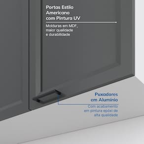 Informações Complementares: Portas de bater almofadadas/molduradas em MDF, dobradiças de 35mm, prateleira interna, puxadores em alumínio.