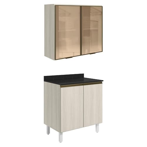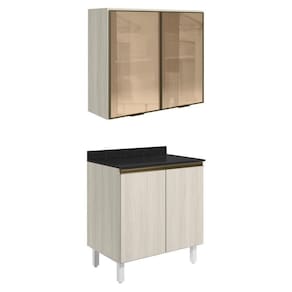 Conjunto de Armário Aéreo e Balcão com Tampo para cozinha, funcional e moderno, ideal para composições que otimizam o espaço com elegância. Fabricado 100% em MDF, com estrutura e tampo de 15mm e forro de fundo de 3mm, o conjunto é composto por 1 armário aéreo com 2 portas de vidro reflecta com dobradiças de 35mm com amortecedores, que garantem fechamento suave e silencioso, além de puxadores em perfil de alumínio e 1 prateleira interna, e 1 balcão com tampo que conta com 2 portas, 1 prateleira interna, puxadores em perfil de alumínio e 4 pés com altura de 15,5cm e regulagem adicional de 1,5cm, assegurando estabilidade em diferentes tipos de piso. Estes móveis chegarão em sua casa separados em 05 volumes.