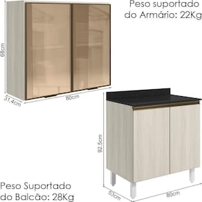 Peso Suportado do Balcão: 28Kg (20Kg tampo, 08Kg prateleira)