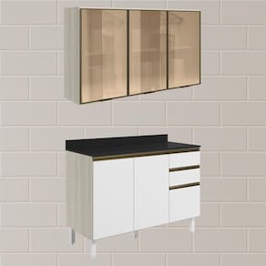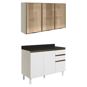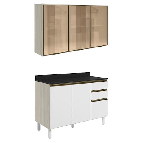 Conjunto de Armário Aéreo em Vidro e Balcão com Tampo para cozinha, funcional e moderno, ideal para composições que otimizam o espaço com elegância. Fabricado em MDF, com estrutura e tampo de 15mm, forro de fundo de 3mm e acabamento em pintura UV (fosco ou brilho). O Conjunto é composto por 1 armário aéreo com 3 portas de vidro reflecta com dobradiças de 35mm com amortecedor, que garantem fechamento suave e silencioso, além de puxadores em perfil de alumínio e 2 prateleiras internas. O Balcão com tampo 15mm que conta com 3 gavetas com corrediças telescópicas, 1 prateleira interna e 2 portas com dobradiças de 35mm com amortecedores. Os 5 pés possuem altura de 15,5cm com regulagem adicional de 1,5cm, garantindo estabilidade em qualquer piso. Estes móveis chegarão em sua casa separados em 05 volumes.