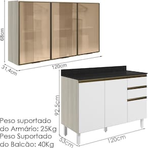 Peso Suportado do Balcão: 40Kg (20Kg tampo, 12Kg gavetas e 8Kg prateleira)