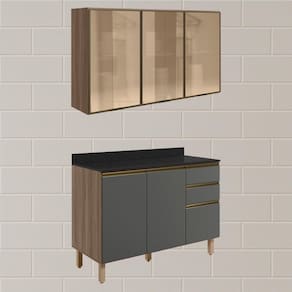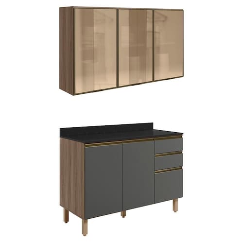 Conjunto de Armário Aéreo em Vidro e Balcão com Tampo para cozinha, funcional e moderno, ideal para composições que otimizam o espaço com elegância. Fabricado em MDF, com estrutura e tampo de 15mm, forro de fundo de 3mm e acabamento em pintura UV (fosco ou brilho). O Conjunto é composto por 1 armário aéreo com 3 portas de vidro reflecta com dobradiças de 35mm com amortecedor, que garantem fechamento suave e silencioso, além de puxadores em perfil de alumínio e 2 prateleiras internas. O Balcão com tampo 15mm que conta com 3 gavetas com corrediças telescópicas, 1 prateleira interna e 2 portas com dobradiças de 35mm com amortecedores. Os 5 pés possuem altura de 15,5cm com regulagem adicional de 1,5cm, garantindo estabilidade em qualquer piso. Estes móveis chegarão em sua casa separados em 05 volumes.