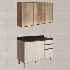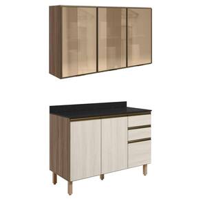 Conjunto de Armário Aéreo em Vidro e Balcão com Tampo para cozinha, funcional e moderno, ideal para composições que otimizam o espaço com elegância. Fabricado em MDF, com estrutura e tampo de 15mm, forro de fundo de 3mm e acabamento em pintura UV (fosco ou brilho). O Conjunto é composto por 1 armário aéreo com 3 portas de vidro reflecta com dobradiças de 35mm com amortecedor, que garantem fechamento suave e silencioso, além de puxadores em perfil de alumínio e 2 prateleiras internas. O Balcão com tampo 15mm que conta com 3 gavetas com corrediças telescópicas, 1 prateleira interna e 2 portas com dobradiças de 35mm com amortecedores. Os 5 pés possuem altura de 15,5cm com regulagem adicional de 1,5cm, garantindo estabilidade em qualquer piso. Estes móveis chegarão em sua casa separados em 05 volumes.