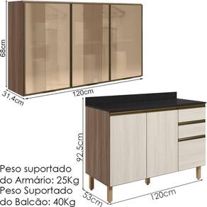 Peso Suportado do Balcão: 40Kg (20Kg tampo, 12Kg gavetas e 8Kg prateleira)