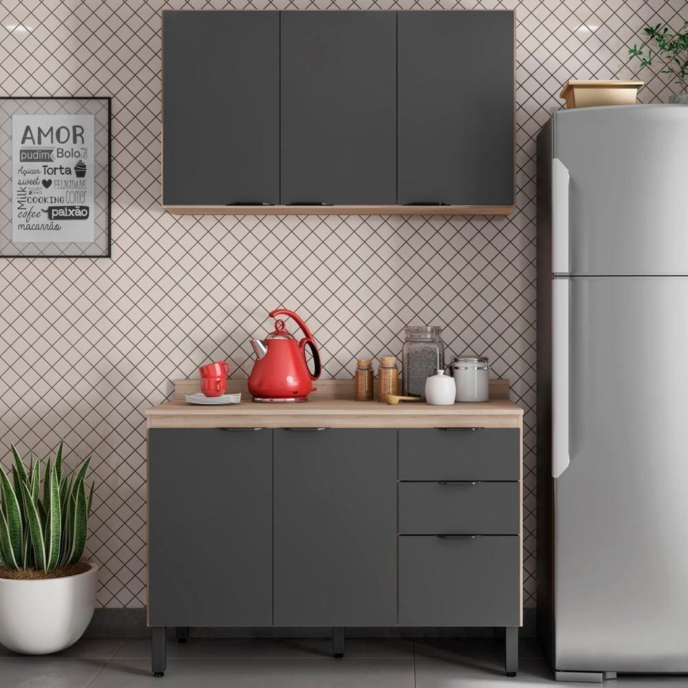 Armário de Cozinha Emilly Box com Balcão e Aéreo Vidro Preto