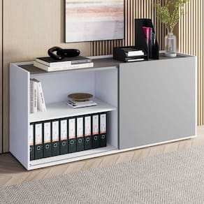 Armário F5 Office com porta de correr e nichos abertos, ideal para organizar com praticidade e estilo. Versátil e moderno, adapta-se a escritórios, home offices e ambientes de estudo, otimizando o espaço com elegância.