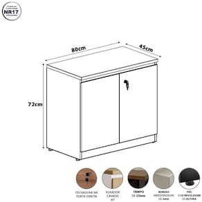 Altura: 72 cm Acabamento da Porta: BP Acabamento da Prateleira: BP Acabamento dos Pés: Pintura Ambiente Principal: Escritório Armário Suspenso: Não codigo_ean: 7900288256737 Complexidade da Montagem: Média: pode ser montado por mais de uma pessoa e/ou necessite de maior conhecimento para montagem Cor: Cinza Sagrado / Branco Cor do Produto: Cinza Sagrado / Branco Cor Flex: Não Cor Interna: Branco Escala de Brilho: Fosco Escala de Brilho da Porta: Fosco Escala de Brilho da Prateleira: Fosco Espessura do Tampo: 25 mm Formato do Armário: Quadrado Itens Inclusos: 1 Armário, Kit Ferragens e Manual da Montagem. Linha ou Coleção: Corporate Manual de Montagem e Instalação: https://product-hub-prd.madeiramadeira.com.br/989109258/documents/24c81499-60d0-47fc-be0c-06e9c016368d3272888659517604505683094.pdf Marca: F5 Office Material da Porta: MDP Material da Prateleira: MDP Material dos Pés: Metal Material Principal: MDP Montagem Flex: Não, o produto só pode ser montado conforme a imagem. Necessita Montagem: Sim Orientação do Armário: Horizontal Origem do Produto: Nacional Pés Reguláveis: Sim Peso: 30 kg Peso Máximo por Prateleira: 10 kg Possui Espelho: Não Possui Mesa Retrátil: Não Possui Nicho: Não Possui Pés: 04 Possui Portas: 02 Possui Prateleiras: 01 Quantidade de Armários: 1 Recomendações de Uso, Manutenção e Limpeza: Para uma limpeza mais efetiva, utilizar apenas pano macio e sabão neutro. Não utilizar produtos abrasivos. Sapatas Niveladoras: Sim Sistema de Montagem: Parafusos e buchas metálicas. Suporta Até (kg): 80 kg Tamanho do Armário: Baixo (Até 90cm) Tipo de Armário: Totalmente Fechado Tipo de Dobradiça/Corrediça da Porta: Metálica Tipo de Puxador da Porta: Embutido Marca: Não Informado
