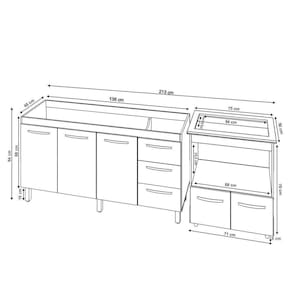 Características do Kit Montado: Largura Total: 213 cm (lado a lado dos dois balcões) Profundidade: 50 cm Altura Total: 85,5 cm (com o tampo do balcão para cooktop)