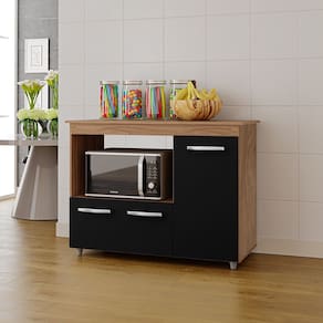 Características: Estrutura em MDP Acabamento em pintura UV 03 Portas com Dobradiças Metálicas Puxadores em Plástico Cromados Pés Fixos Amplo Espaço Interno para Organizar Utensílios Nicho para Forno ou Microondas