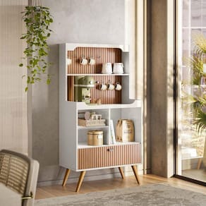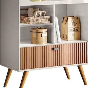 Armário Bancada Cantinho do Café Off White Perolizado/Tauari Ripado 1 Porta Basculante com Pés de Madeira - Lukaliam