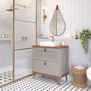 CARACTERÍSTICAS ARMÁRIO: - Gabinete para Banheiro com Cuba desenvolvido em MDF - Porta em MDF revestido com tela sintética de fácil limpeza e antimofo - Acabamento em pintura BP. - Cuba em mármore sintético. - Amplo espaço interno - Porta com pistão à gás - Puxadores de estilo retrô em couro sintético.