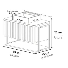 CARACTERÍSTICAS: - Gabinete suspenso para Banheiro com Cuba desenvolvido em MDF - Acabamento em pintura BP. - Cuba em mármore sintético. - Amplo espaço interno - Porta com pistão à gás - Puxadores de alumínio.
